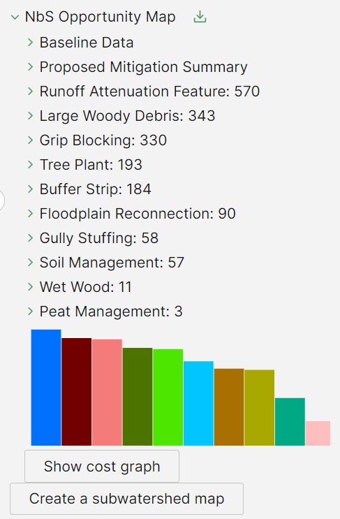 The Opportunity Mapping can be downloaded in a tabular format, which can be an Excel or CSV format. The tabular format downloads the information from the Proposed Mitigation Summary, and provides information for each intervention type and the whole catchment. A range of baseline information is also included.