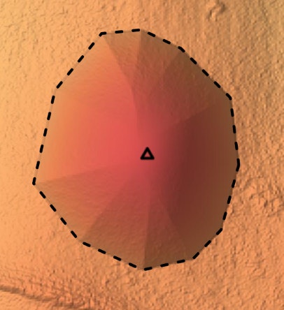 Setting the elevation in a single point. SCALGO Live interpolates between the terrain and the point elevation inside the area enclosed by the dashed line.